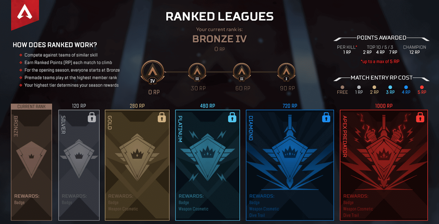- “Reward competitive players for the time they invest in Apex Legends. We do this through a ranked ladder that shows how you stack up against the rest of the player base. Additionally, you will receive in-game rewards at the end of the season based on the rank you achieve.