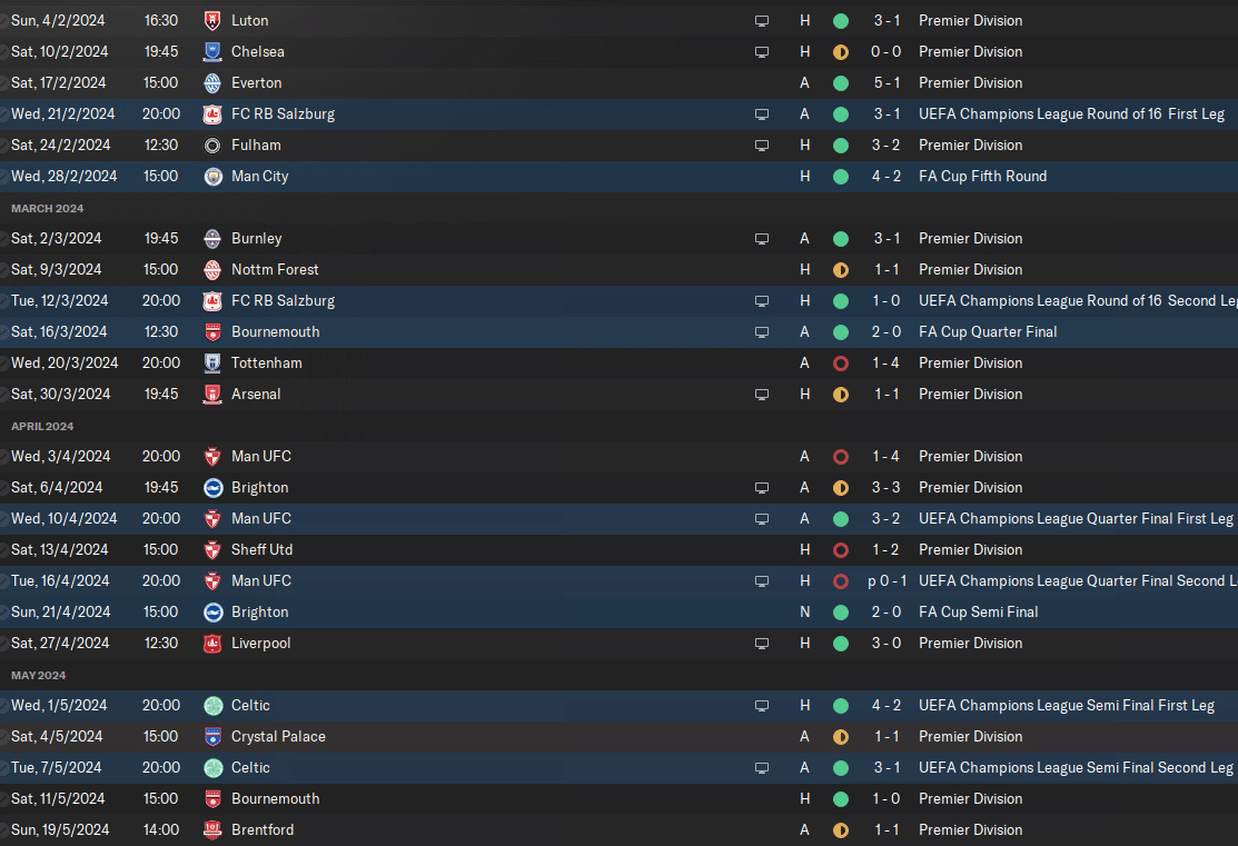So, we tested this tactic for a full season in our FM 24 story, and spoilers for that but it’s pretty bloody good. Now, we’ll admit, in our testing it left us really exposed at the back, some of that might be down to Schar not being as good in FM as he is in real life, and also the fact Bruno G isn’t the best DM (we fix it in the second season don’t worry). But as you can see in the table below, it’s a really nice tactic, that got us to a solid league finish and two cup finals. You’ll need to check out our FM Story to find out if we won those or not.
