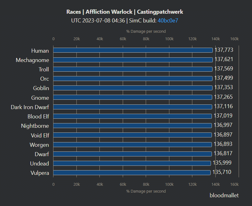 The data above from Bloodmallet gives us some idea of how close the spread of DPS is. Again, you can simply play what you want, but it’s clear that Troll and Dwarf are two of the best options for Demo. The numbers are the top are much closer for Destruction, so while Troll is lower, relatively speaking, it’s only 300 or so DPS. Overall, Human is pretty consistent for Alliance, alongside Mechagnome. It’s probably best to look at the worst, with Vulpera and Undead consistently at the bottom of the lists.