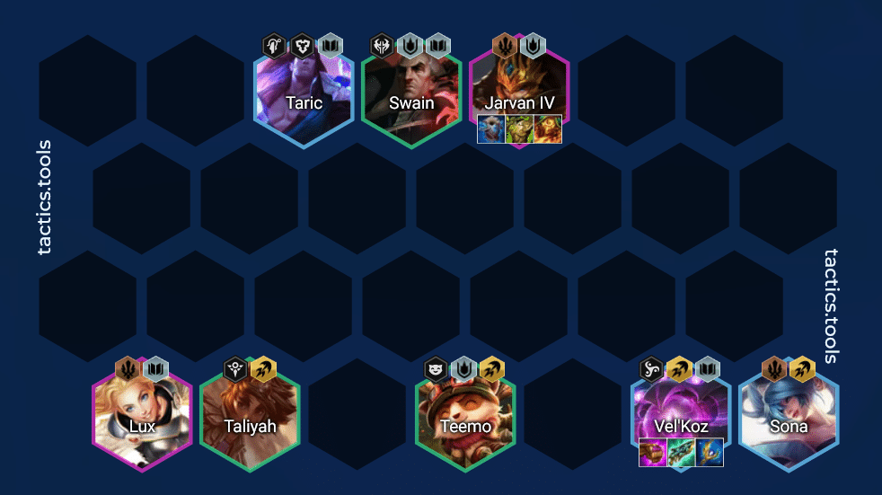 Item priority: AP items to Vel’Koz, Archangel’s + Jeweled Gauntlet >> Gunblade >> Shojin, Statikk. Tank items are for Jarvan, his BiS is Warmog’s + Protector’s Vow, but make sure to leave one slot for the Prismatic item from Demacia.
