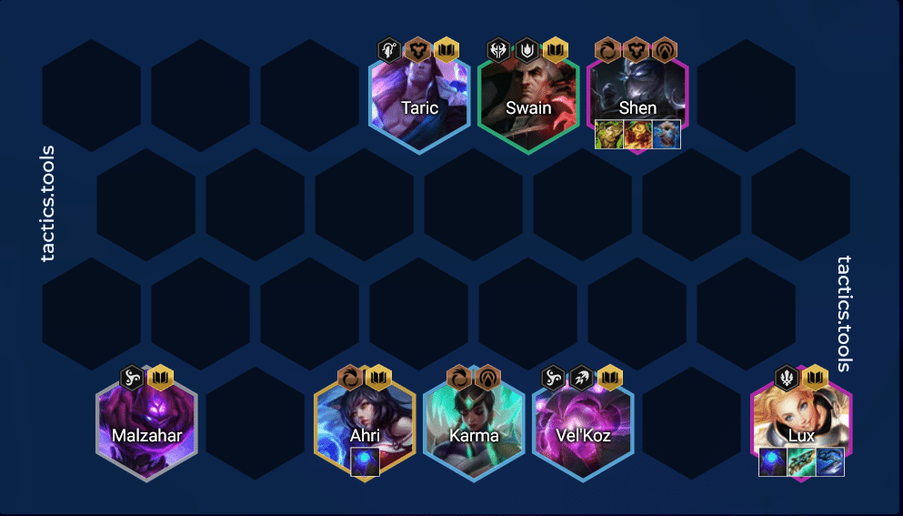 Mid to late game: Go level seven on 4-1 and roll for Lux and Shen. If the rest of your team is upgraded and you have six sorcs, try to go for level six to find Ahri as your secondary carry.