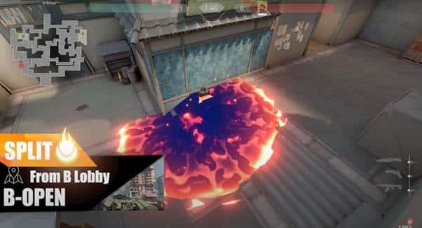 The B Open site is the best place to plant a spike because it gives the defenders the tiniest edge when defusing it. In this spot, the defusers only have a few wall covers to protect them from attacks coming from all sides. Learning this Brimstone lineup can be a massive step towards solidifying your victory on the B site after getting the open plant.