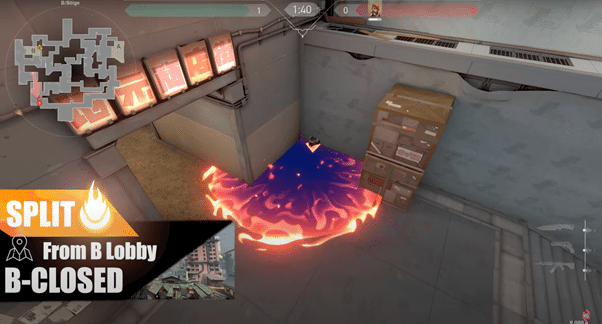 The B Closed is a viable plant spot when the attackers successfully seize control of the B site. Opting for the default and open plant position frequently will cause the defenders to adapt to your predictable patterns and employ counter strategies to disrupt your plant attempts. Therefore, attempting a B Closed spike plant will add an element of unpredictability to your tactics. To put the icing on the cake, this B Closed Incendiary lineup can almost guarantee your team a round victory after securing a successful plant.
