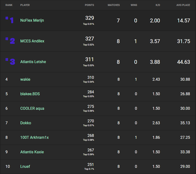 For this event, players would begin earning one placement point per player casualty after the fifty players remained. Ten points went to the player who took first place in each match. Additionally, competitors would earn five points per elimination instead of the usual one point in past tournaments. Overall, this yielded much higher scores, and strategies changed quite a bit per player.