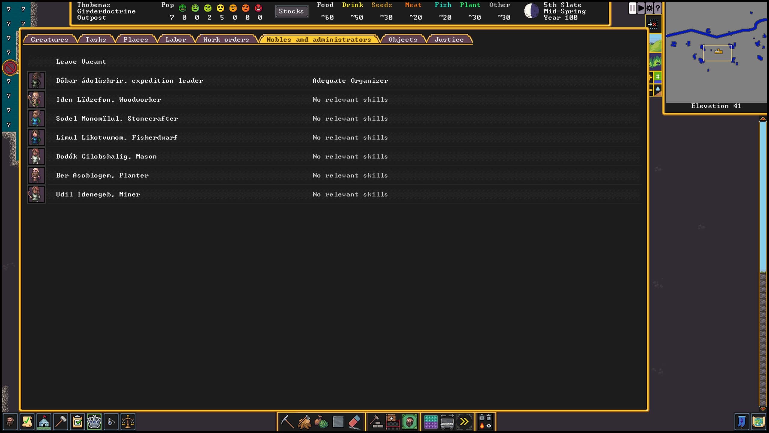 Now it’s time to automate all of this. Don’t worry. This is quite easy. Click nobles and administrators and assign one of your dwarfs to the position of manager. One of your dwarfs should have some management skills but it’s not that important yet.