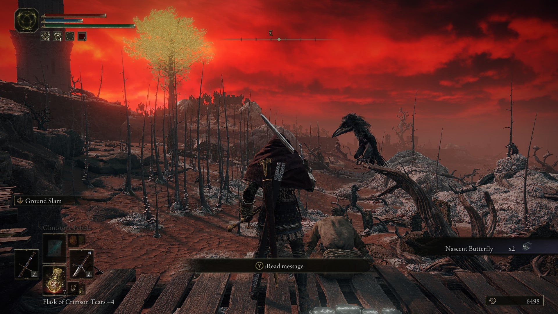 I head further east and find a burned down cathedral, still in flames. There I have an unfriendly encounter with a nun that took a bite out of me. Took me two.. maybe three attempts to tell her off and I notice that the sky had turned red. I head further and realize that this is not the kinda place I want to be in. Blood red skies, big birds and scary tall guys with masks? Nope, we’re gonna head north like the game wants us to.