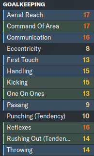 Keepers can be fairly weird in FM24, and Giorgi isn’t helped by the fact he’s been sold to PSG and isn’t starting. That said, he’s still young, and keepers on FM rarely lose much of their edge as they get older. His distribution is likely his biggest weakness, but if used in a sweeper-keeper role, and trained to help his short distribution you would easily see the results.