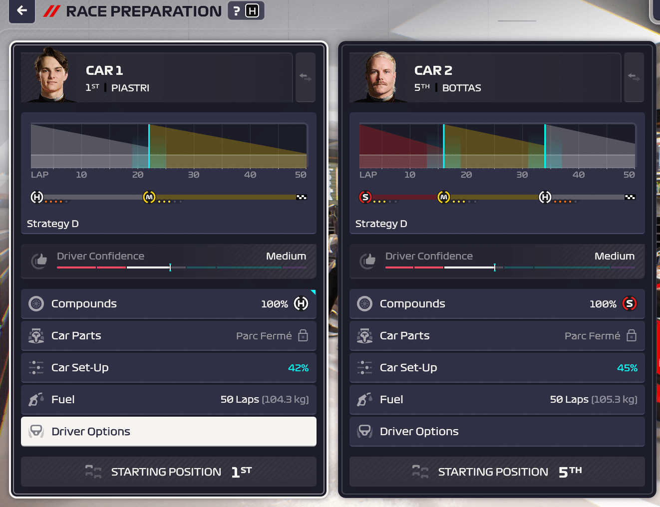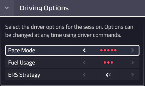 If you take a look at the screenshot above, you’ll see the Driver Option section highlighted. Here, you can adjust the start of race options to push your car. While you can also just do this the second you start the race, you’ll probably not see any impact by turn 1, which is the most important part. It’s not the end of the world if you forget to do this, but it’s worth doing on the opening 5 laps. Just monitor the car, especially the ERS as you don’t want that to drain.