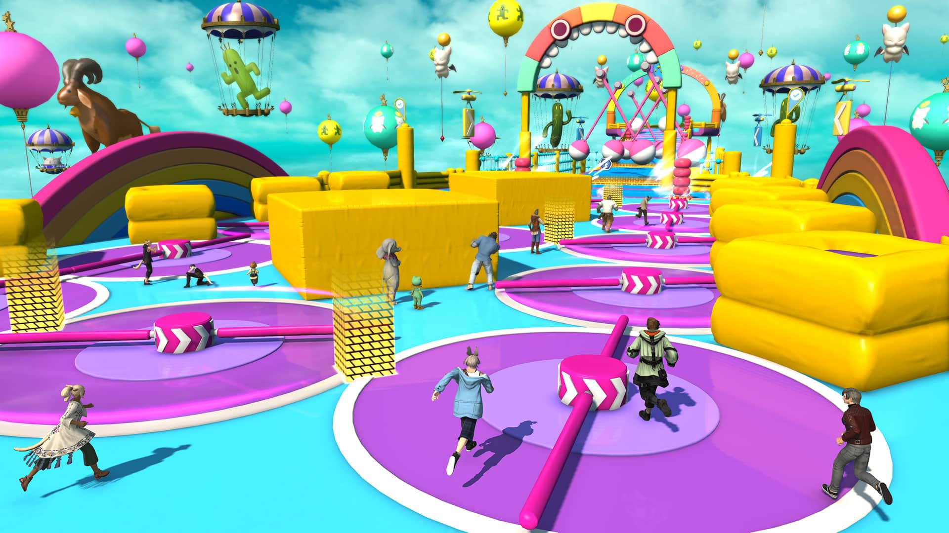 The FFXIV Fall Guys Collaboration Event brings the Fall Guys gameplay into Final Fantasy XIV. Here you can jump into one of the many obstacle courses. There are currently 5 in total and each of them combines FFXIV raid mechanics with those challenging, wacky courses.