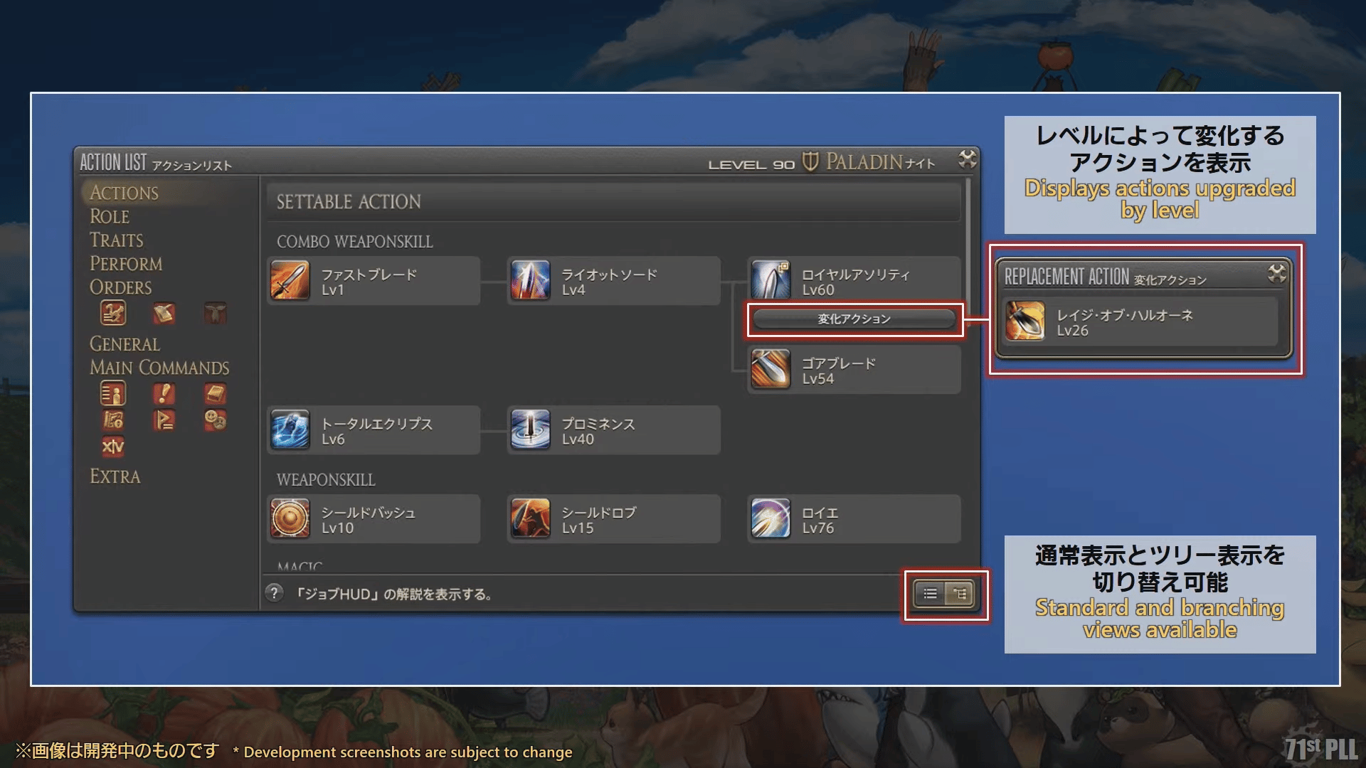 Anyways.. oh there is also an UI update to the action list. Now it’ll not just display skills in the order you’ll get them during levelling. Alternatively it’ll also sort your skills into categories and show you how they combo into each other or when and how they upgrade. But you’ll also still be able to switch back to the the current list at any time.
