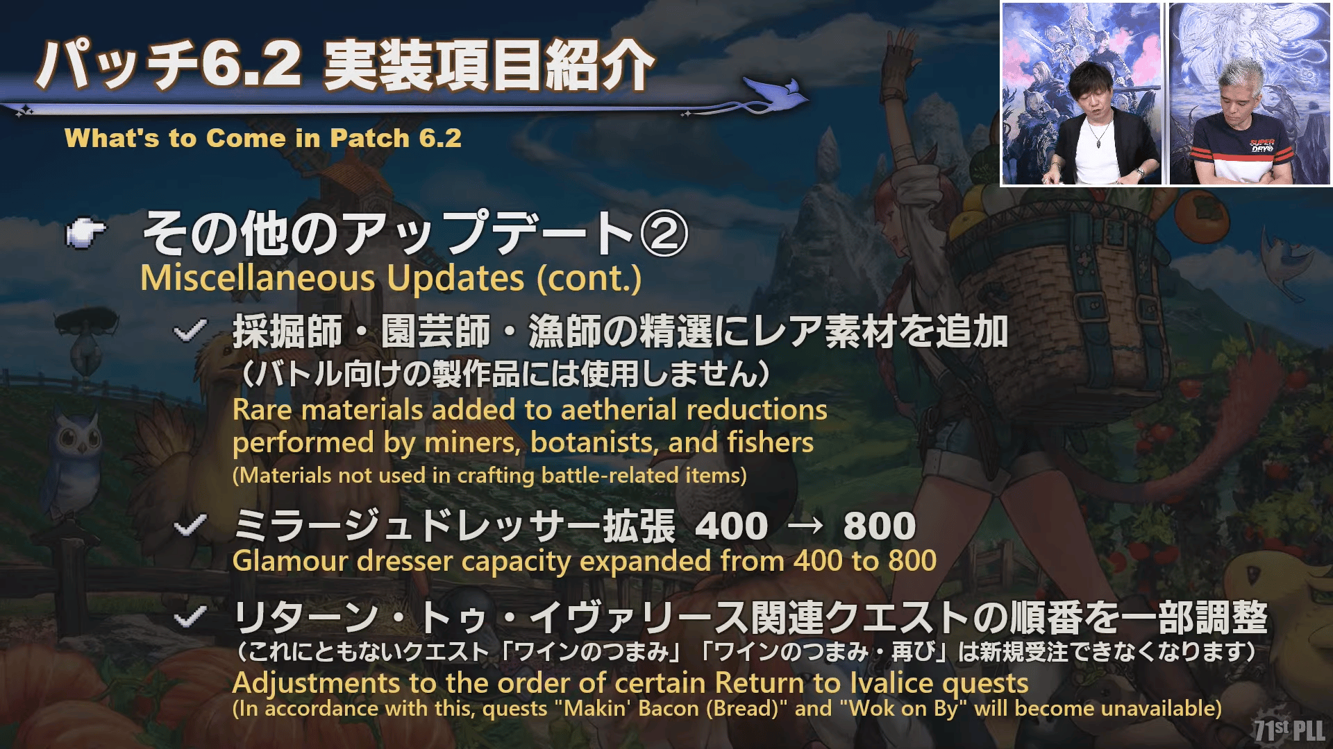 And finally we’re getting the most important upgrade of them all, the glamour dresser is being extended to up to 800 slots. that’s almost double! And Yoshida was already very sure that within a few months, players would complain again. Because 800 item slots are still not enough to create the perfect array of outfits for every single job.