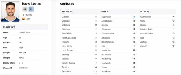 David Costas currently plays for the Spanish second-division club Real Oviedo. Looking at his statistics as a center-back, it’s apparent he could be an unexplored treasure. With a decent determination score, there’s room for him to develop into a more refined defender. There’s a lingering uncertainty, however, about his future progress due to his age, as he has already reached 28 years.