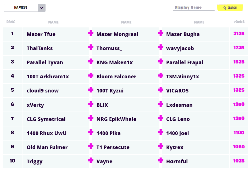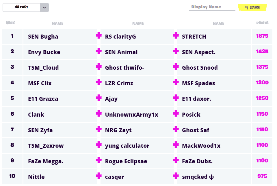The point leaders coming out of NA East are none other than the team of World Cup Champion, SEN Bugha, alongside RS clarityG and STRETCH. After opting to stream the FNCS qualifiers, Bugha went with clarityG and STRETCH over organizational teammates SEN Aspect and SEN Animal. This trio finished 450 points ahead of second-place and was always at the top of the weekly leaderboards. Bugha, STRETCH and clarityG achieved results of 4th, 6th, 2nd, 5th and 3rd coming in.