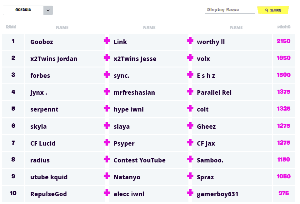 The Oceania region ultimately became a two trio region. The first seed from this region is the trio of Gooboz, Link and worthy. This trio spent a lot of team at the top of the weekly leaderboards during the qualifiers. With the results of 3rd, 3rd, 1st, 1st and 5th, they managed to keep the Oceania region under control. Link, Gooboz and worthy are amongst the favorites for the Oceania FNCS Finals.