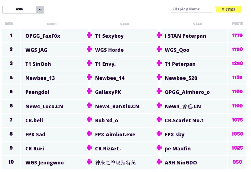 Finishing just behind first place is the trio of WGS Jag, WGS Horde and WGS_Qoo. They claim the second seed after a season-long effort yielding results of 3rd, 1st, 10th, 3rd and 8th. This trio did their best to take the top spot but ultimately fell just short. The Asia region can realistically be won by any of these top teams as the gap is much narrower. We will have to see how this plays out this weekend.