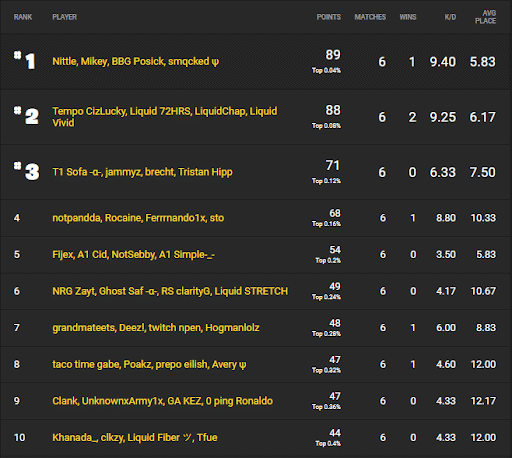 In keeping with the same format as Season X, squads must play out three rigorous rounds of competition and maintain consistency throughout. Each round included a 3-hour block of time where each squad would play as many matches as possible whilst accumulating points along the way. Each round whittles teams down, little by little, until only 25 remain for the finals. Let’s see who topped the leaderboard in each region as we look forward to the official start of the Fortnite Champion Series in Chapter 2.