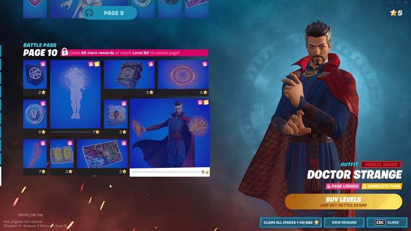 Chapter 3 Season 2’s final Battle Pass page belongs to Marvel character Steven Strange, also known as Doctor Strange. He fits nicely into the Marvel Series classification, including various other superheroes and villains. Doctor Strange’s set features Spellwork Scimitar (Pickaxe), Mandal Disc (Glider), Book of Cagliostro (Back Bling). The Doctor Strange cosmetic outfit is the last item you can unlock on page 10.