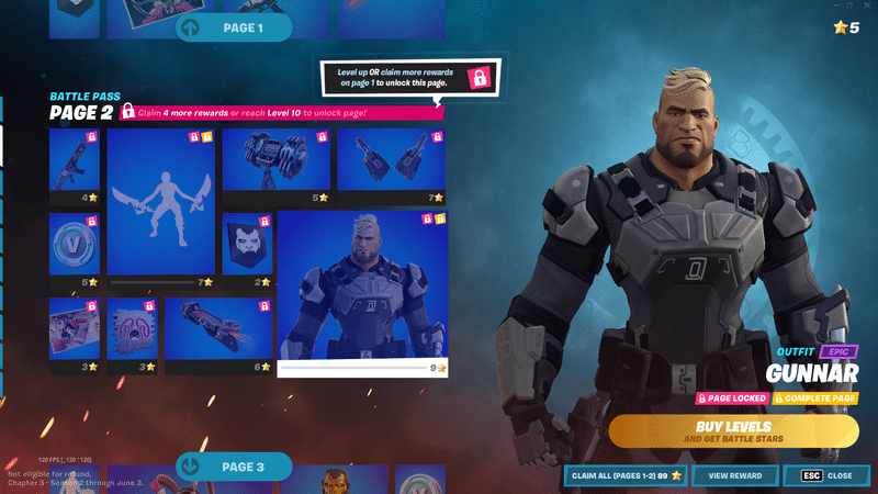Page number two marks the debut of the Imagined Order (IO) enforcer known as Gunnar. Those who played last season should recognize this character as the boss of Covert Cavern. Now, he is unlockable in-game. He’ll cost nine Battle Stars once reaching page two, and you’ll have to collect all cosmetics on this level before you can play as Gunnar. Other items on this level include a surfing Glider, dual-wielded Pickaxe, Emote and more–most of which honors the IO warrior.