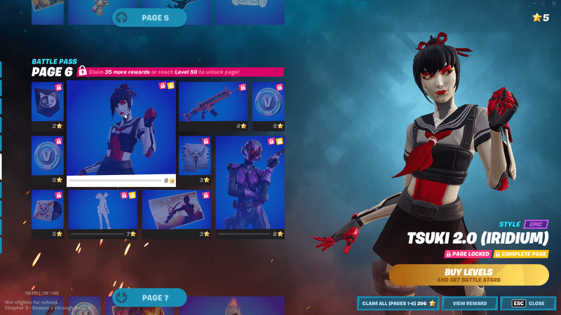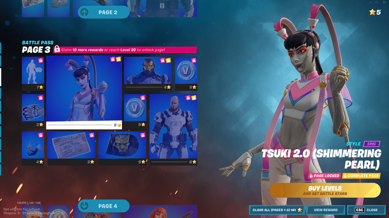 Players that reach page 3 can secure alternate styles of Tsuki 2.0 (Shimmering Pearl) and Gunnar (Arctic Tac). This tier also features 200 V-Bucks, an Emote, a helmet version of Gunnar, a Loading Screen and a Lobby Track. You must unlock the entire page to get Tsuki’s second style.