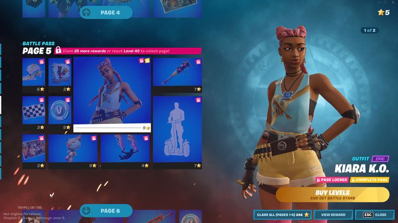 Kiara K.O. – a member of the Imagine Order – owns page 5 of the Battle Pass. The description lists Kiara as “beloved leader of the Tango squadron.” She is only unlockable after you claim every item available via page 5. You can also collect a segway Emote, free V-Bucks, a Glider, Pickaxe, Back Bling, Contrail, Loading Screen and Emoticon. Kiara comes standard with a sunglasses style.