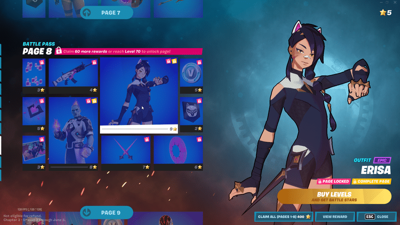 A new anime-style character named Erisa joins Fortnite Battle Royale on page 8. The Battle Pass describes her as “A lost princess from a forgotten realm of warriors.” It’s not clear from the outset which side she fights for, but it’s safe to assume she is in favor of The Seven. The eighth page features several Erisa-themed cosmetics and another variant of The Origin (Granite Grey). Players must secure all rewards on page 8 before claiming Erisa.
