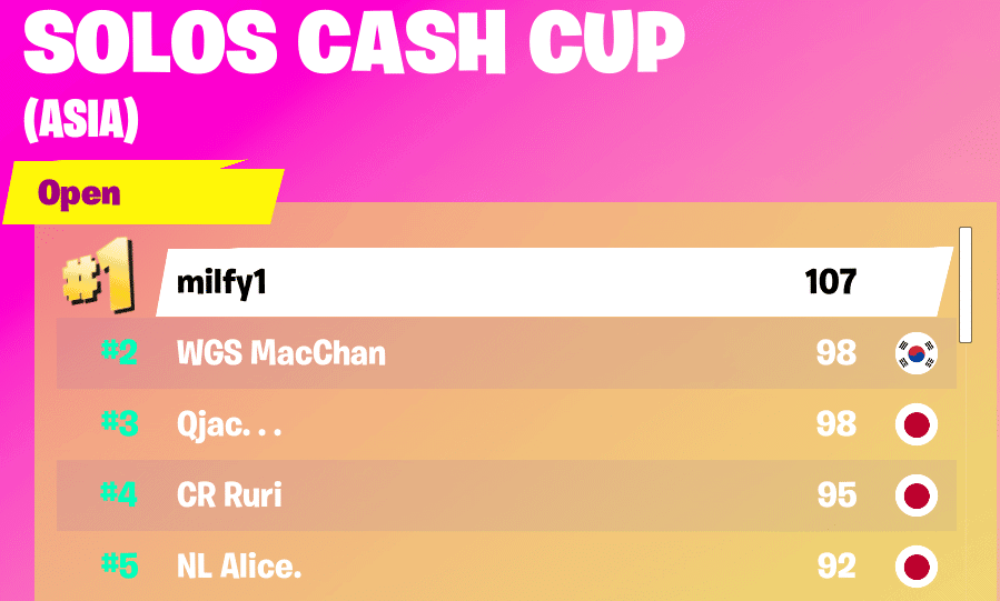 Milfy1 took down the Solos Cash Cup for the Asia region. Over fourteen matches, he accumulated a paltry forty eliminations when comparing to other regions. The effort was there, however, as he clutched up and earned four Victory Royales. This display eventually separated milfy1 from the remainder of the top five and he went on to collect the top prize.