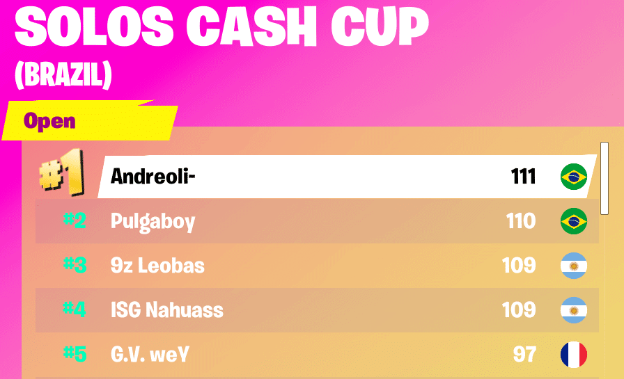 Andreoli finished in first ahead of Pulgaboy by just one point to win the Solos Cash Cup for the Brazil region. In total, he completed thirteen matches and performed well overall with four Victory Royales and 111 points. In addition to this, he put up fifty-one eliminations, but the Victory Royales separated him from the pack. Perrenial contender, Pulgaboy, put up a solid effort and ended up finishing with 110 points. As a usual contender in this region, Pulgaboy remains at the top in terms of Solos Cash Cups for Brazil.