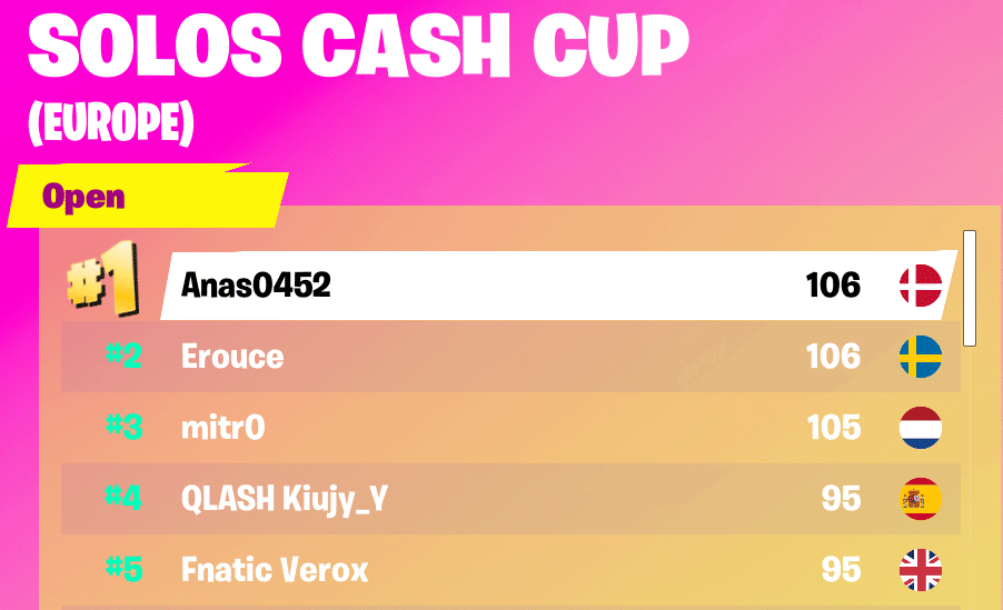 Competing out of Denmark, Anas0452 made his first top-five appearance for the European Solos Cash Cup. With 106 points, Anas0452 tied with Sweden’s own, Erouce. The leaderboard flipped often over the four-hour time limit for the Solos Cash Cup. The performed admirably in the Cash Cup with fifty-three eliminations and three Victory Royales. Anas0452’s best match yielded thirteen eliminations an a Victory Royale.