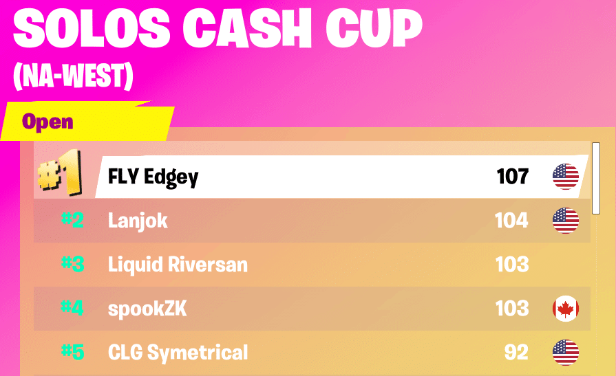 Another week, and another insane performance out of FLY Edgey. Many know Edgey as a top contender in the Fortnite Champion Series with teammates Liquid Cented and rehx. The Solos Cash Cup provided Edgey some solid practice on his own, which he took full advantage of. Edgey played out fourteen matches and compiled 107 points with fifty-six eliminations and three Victory Royales. This elevated him above Lanjok, who took second place. Edgey’s end result was in question until his final match, where he put up six eliminations and a Victory Royale to secure the victory.