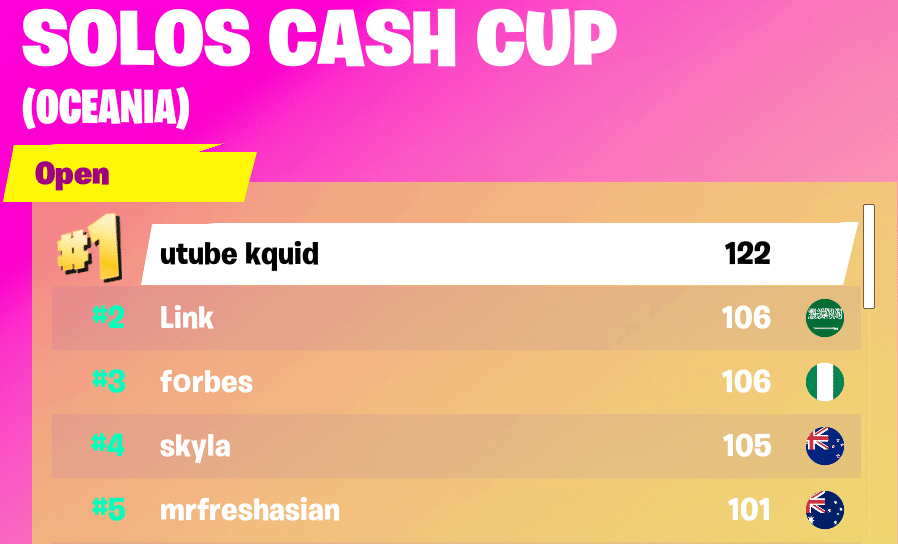 The Oceania Solos Cash Cup experienced total domination at the hands of kquid. After only playing eleven matches, kquid blew away the competition with 122 points. He managed two Victory Royales on top of sixty-one eliminations. Kquid executed perfectly in two consecutive matches where he earned back-to-back Victory Royles with twelve and thirteen eliminations respectively. His average placement throughout the tournament was 11.45, which undoubtedly helped him attain the top spot.