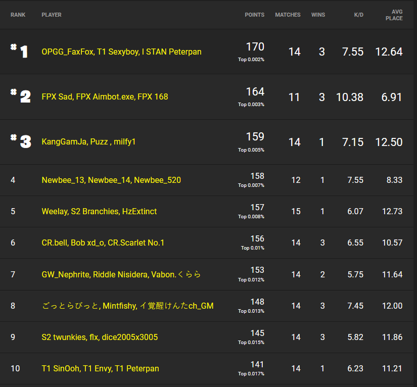 Last, but not least, the Asia region for the Trios Cash Cup went to OPGG_FaxFox, T1 Sexyboy and I STAN Peterpan. Overall, Perepan might be the most significant player in the entire region. He consistently appears at the top of the leaderboard, as does Sexyboy and FaxFox. This time around, these three accumulated 170 points along with 3 Victory Royales and 83 eliminations. The performance speaks for itself, in that Peterpan, Sexyboy and FaxFox are marquee names in the Asia region. Their last two matches yielded Victory Royales.