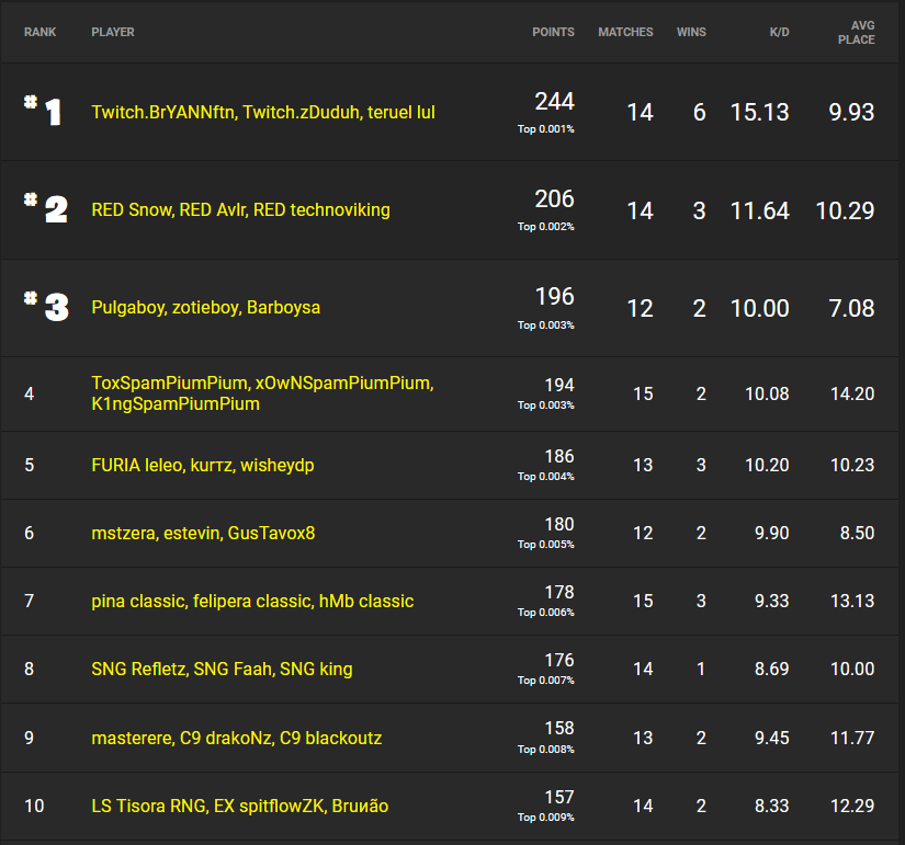 First place for the Brazil Trios Cash Cup went to BrYANNftn, zDubuh and teruel lul. They managed to complete 14 matches and won almost half of them with 6 Victory Royales. In total, they put up an astounding 244 points to take first place by a country mile. BrYANNftn, zDubuh and teruel lul were slayers of the Brazil region with 121 eliminations between the three of them. Ultimately, their margin of victory put all eyes on this trio moving forward.