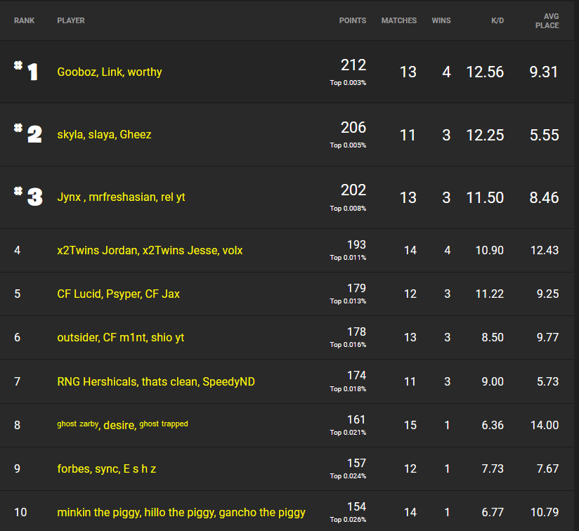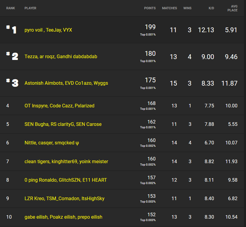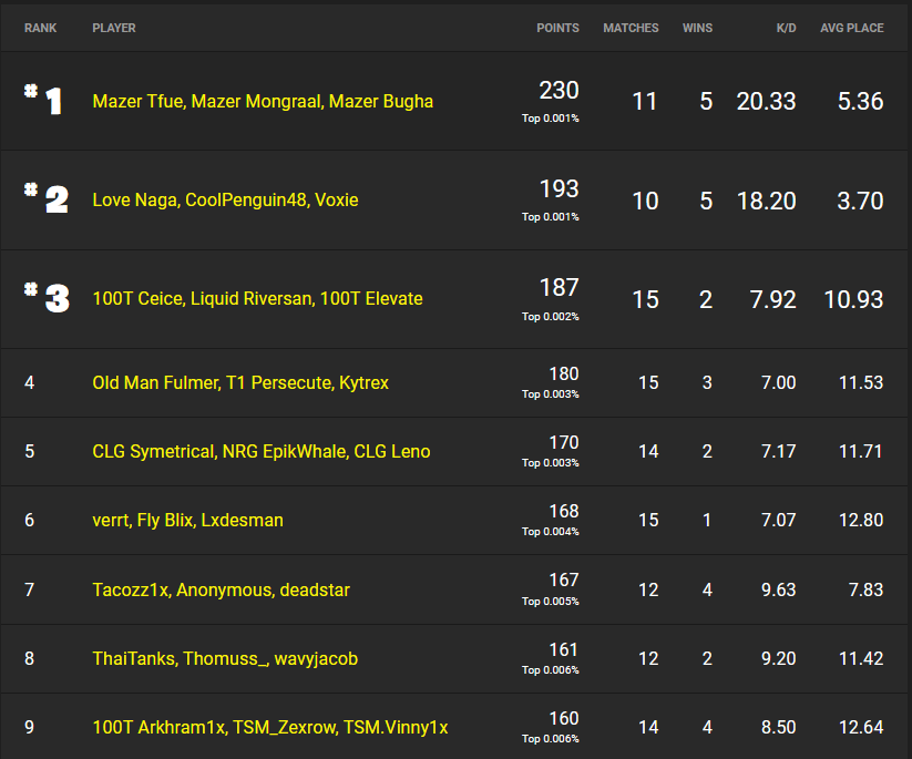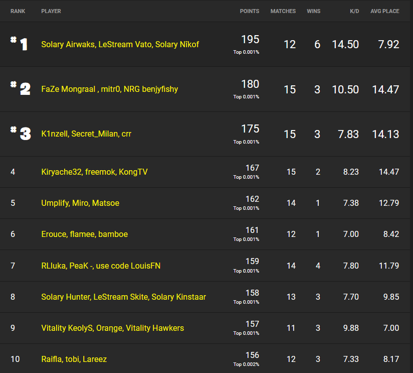 Finishing 15 points behind our last team was the trio of K1nzell, Secret_Milan and crr. This trio played out 15 matches and had 3 Victory Royales in total. Overall they managed 94 eliminations and 20 of those occurred in one game in which they achieved a Victory Royale. K1nzeel, Milan and crr are most certainly on the shortlist of teams in play to compete at the FCS Grand Finals.