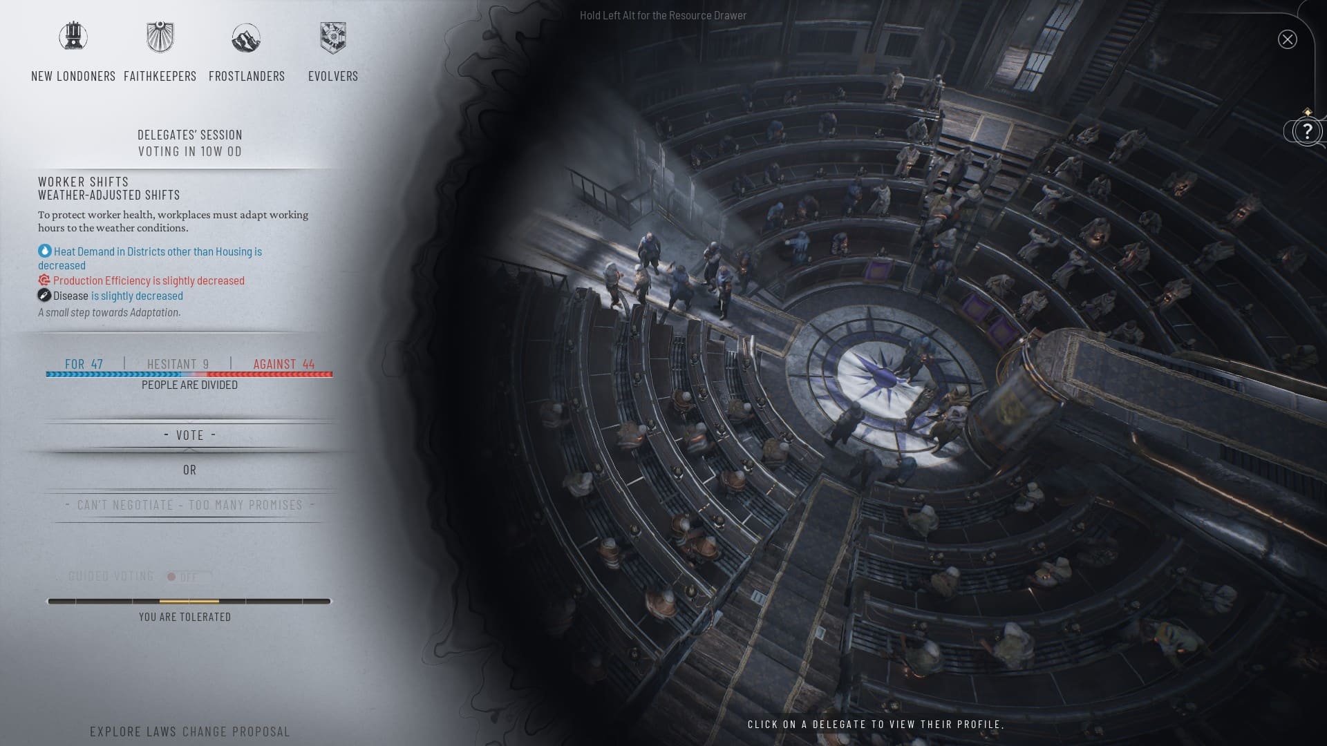 You won’t always have the necessary number of people in favor of the law you want to pass. For this reason, it is important to keep in mind that Frostpunk 2 gives you the ability to negotiate with those who are hesitant, so that you can convince them to vote for (or against, if necessary) a certain law.