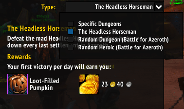 Once you join the instance, simply finish the fight and loot the Horseman’s body for your Loot-Filled Pumpkin – this is how you’ll get the mount. You can do this once per day per character, and you’ll need to be level 10-50 to queue.