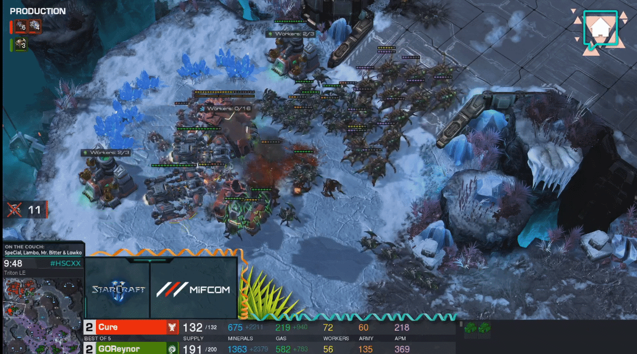 Reynor opened the first match poorly when Cure crushed him with a successful Thor-Siege Tank combo, and a successful harassment strategy of his drones by Hellions and Battlecruisers. In the second match, Cure switched things up by going for a Marine-Marauder combo army backed up by Medivacs, but with a surprise, Baneling hit late in the match, Reynor managed to wipe out most of Cure’s forces and tie-up the score at 1-1. In the third match, Reynor would once again prove unable to stand up to Cure’s previous mech strategy of Siege Tanks and Thors, along with the harassment of his drones back at base. Though Reynor tried to hang-on for as long as he could, Cure won placing the score at 2-1. In game 4 of the match-up, it seemed as if Reynor had finally figured out how to counter Cure’s overall strategy. First by using queens to fend off any harassing Battlecruisers. Cure once again tried to crush Reynor with a large army of Thors, but by this time Reynor began using Zerg Vipers to pull individual Thors out of their group and pick them off one by one.