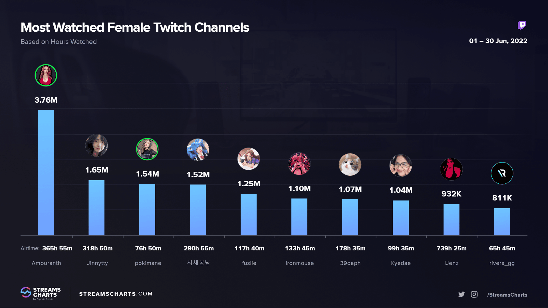 The data, gathered from Stream Charts, list the top 5 most-viewed female streamers in the month of June 2022.