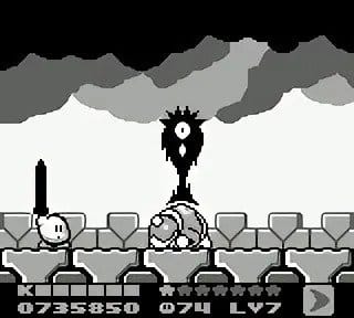 Game Boy graphics aren’t great. We know this. The appeal of the Game Boy wasn’t great visuals, it was performance of a video game on the go. That being said, Dream Land 2 does a great job of getting the theme of Dream Land across to the players. It’s as simple as trapezoid shaped hills, star designs on objects, and spikey or round enemies. Even today all the familiar enemies back from the original games still have the same design today, because they make up the theme and design of Dream Land. After all, Kirby is a big round ball with flat feet. How hard can it be to get him perfect on any console?