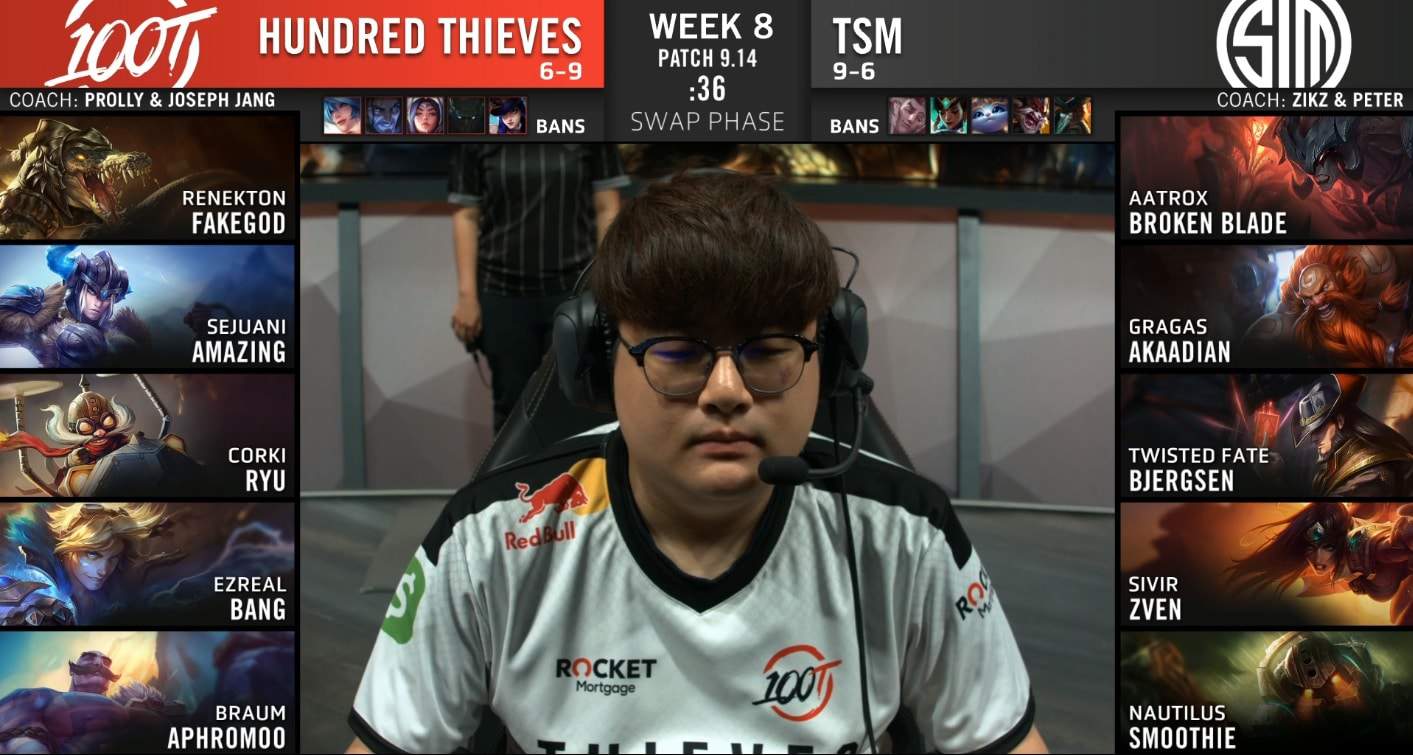 The 100 Thieves (“100T”) won a crucial match against Team SoloMid (“TSM”) to keep their playoff dreams alive. 100T played exceptionally well and it seemed as though TSM never had a chance. The first 10 minutes were quiet, but it kicked right off at 13 minutes. At this time, a skirmish broke out in the top lane that resulted in the first two kills going over to Ryu. Amazing returned to the top side two minutes later to assist FakeGod in killing Broken Blade and taking the First Tower bonus in the lane. With this, FakeGod’s Renekton was truly unlocked.