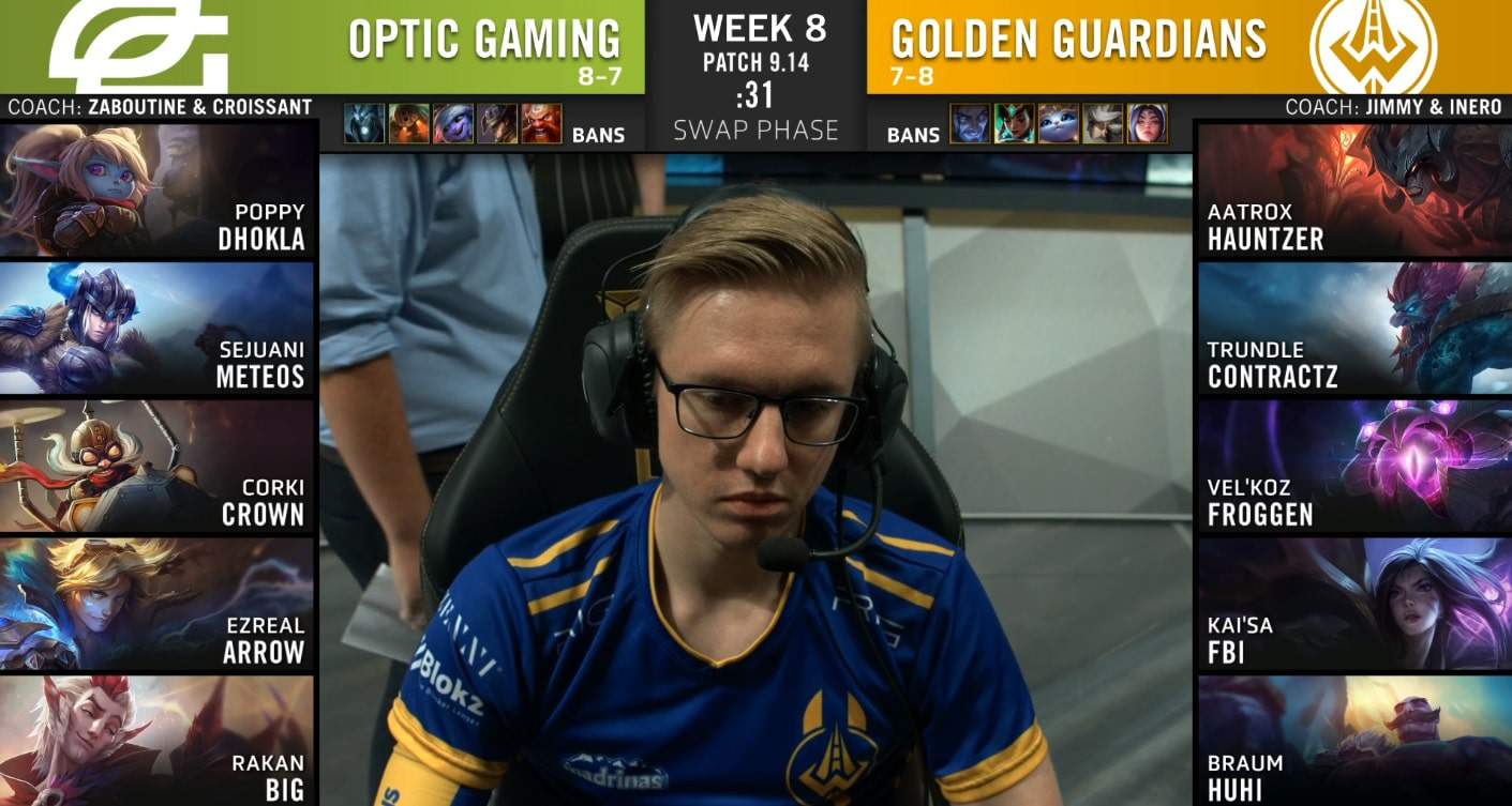 The Golden Guardians (“GGS”) took a big win over OpTic Gaming (“OPT”) in the first game of the day. It wasn’t the most action-packed game, but GGS’ early game leads translated very well to team fights. Contractz started it off by helping FBI get First Blood onto Big, taking an Infernal Dragon and killed Big again bot. Meanwhile, Hauntzer was dominating Dhokla, and Contractz used the Rift Herald to get him plate gold and set him up for the First Tower bonus. Though Crown was ahead in the mid lane, GGS was in a commanding position.