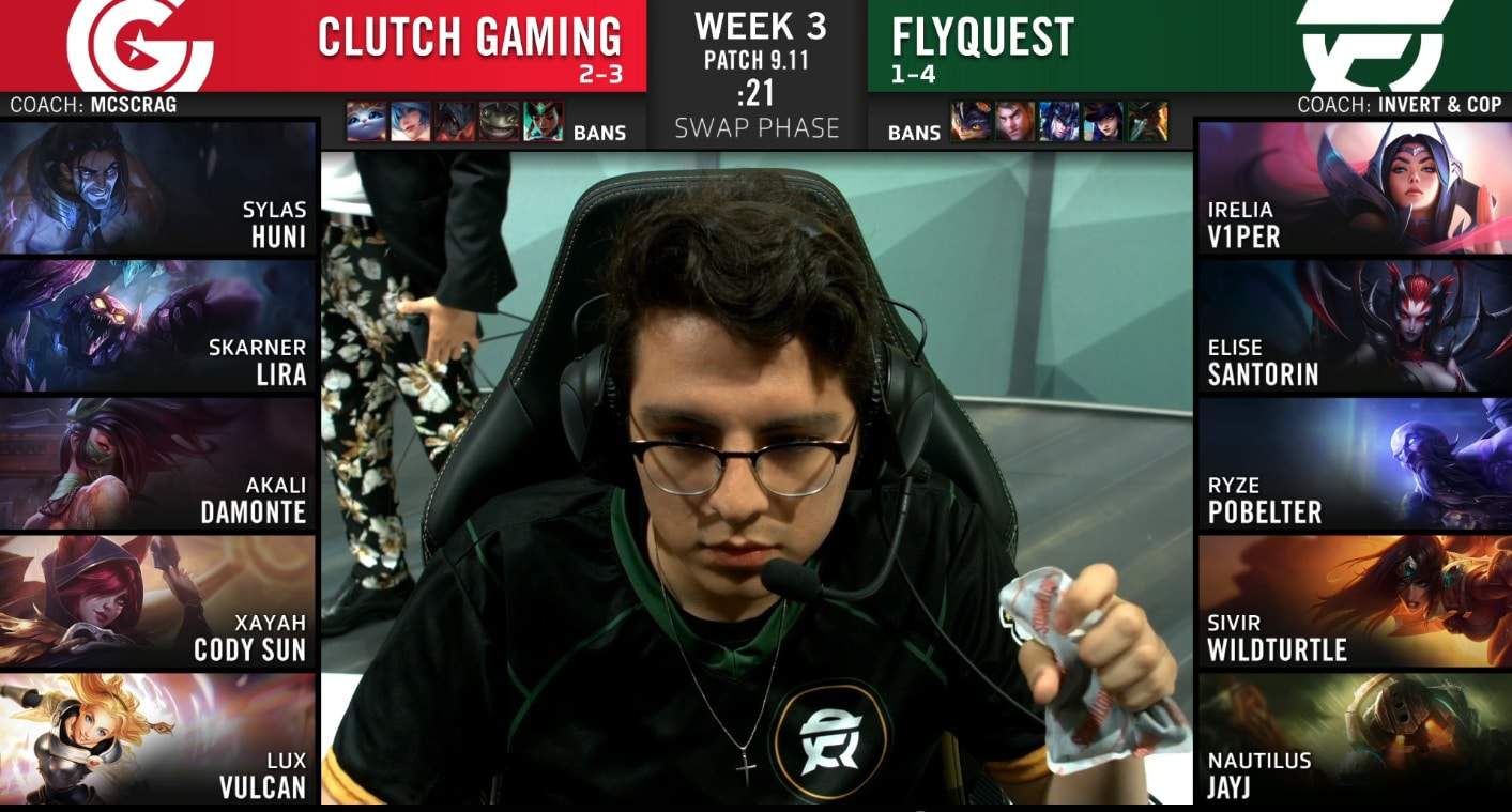 FlyQuest’s (“FLY”) struggled continued today with another loss, this time against Clutch Gaming (“CG”). It was an even but quiet, with Santorin securing First Blood with a bottom lane gank and CG diving to kill Pobelter top. But CG soon pulled ahead, claiming multiple objectives for themselves to advance their gold and tower lead. This helped CG to rush the Baron and secure it without a fight.