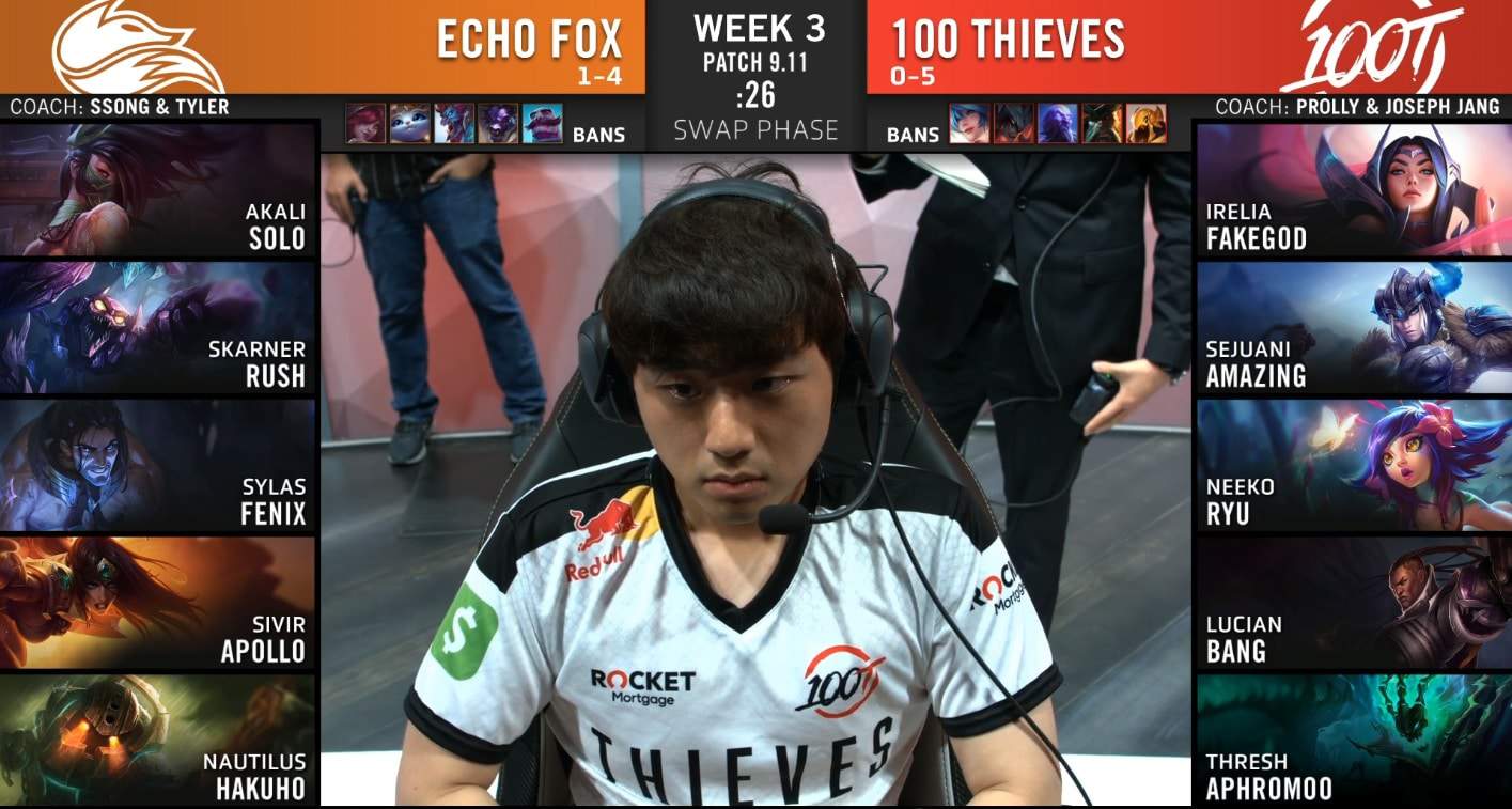 100 Thieves (“100T”) finally ended their loss streak with a close win over Echo Fox (“FOX”). The early game was fairly even, as both junglers found successful ganks and Solo solo killed FakeGod twice. 100T pulled ahead at 12 minutes though when they won a team fight and denied FOX the Rift Herald. It didn’t last all that long though, as FOX turned it back in their favor with a two-for-one team fight win at 22 minutes.