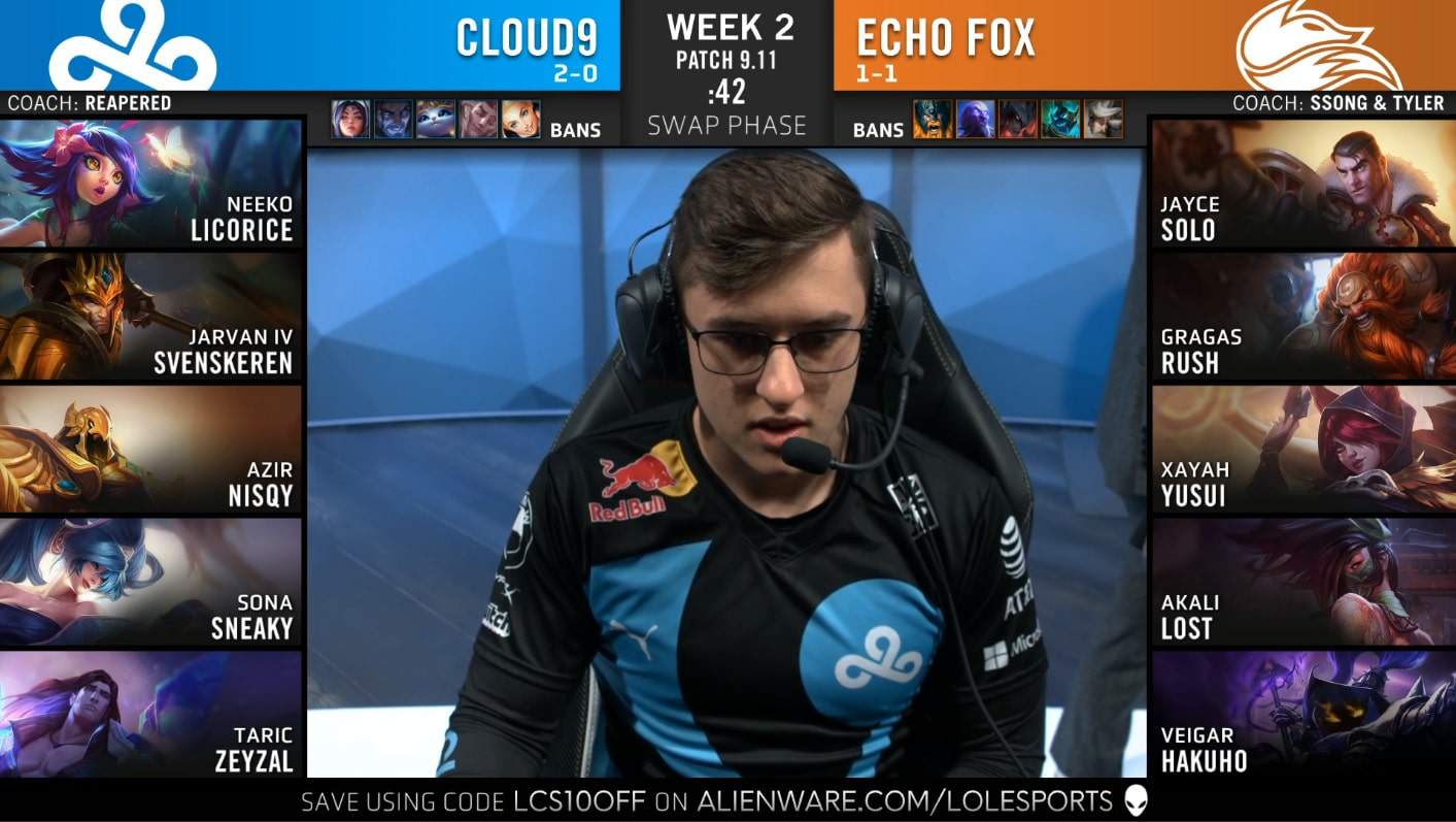 The first game of the week featured C9 taking down Echo Fox with a terrifying team fighting composition. The C9 bottom lane was gifted First Blood from a Svenskeren gank, but Rush helped Yusui and Lost gain some kill gold in their lanes. At 13 minutes the teams met up at the dragon pit, where C9 won 2-0. Solo and Yusui had decent advantages they had amassed, while C9’s composition was clearly starting to scale.