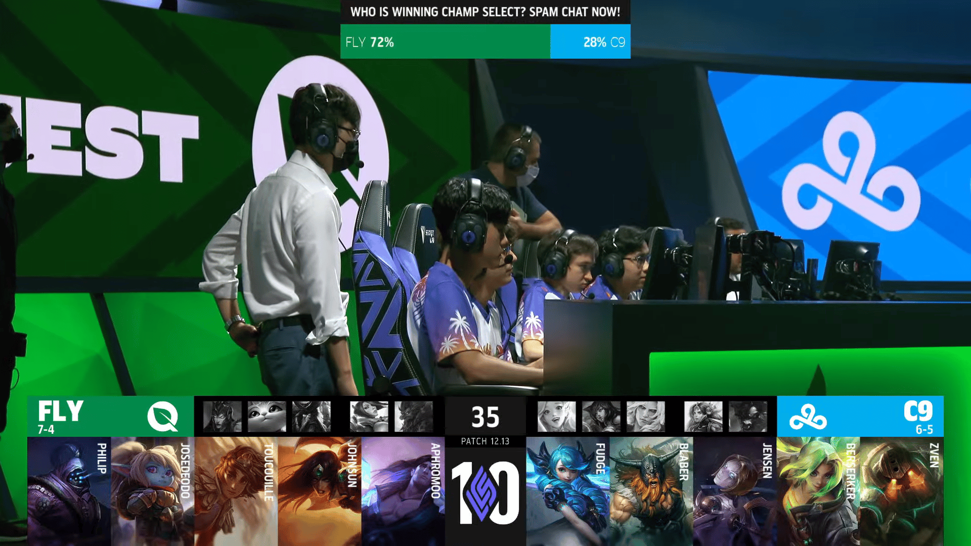 With no FLY member on the map, C9 got the soul and the Baron, which extended their lead to nearly 8k gold. C9 sieged mid and bot taking both inhibitors with their Baron. FLY decided to engage after losing the second inhib with a flank from Philip, but with 12.5k gold behind they did not stand a chance as C9 ended the game in a dominating fashion.
