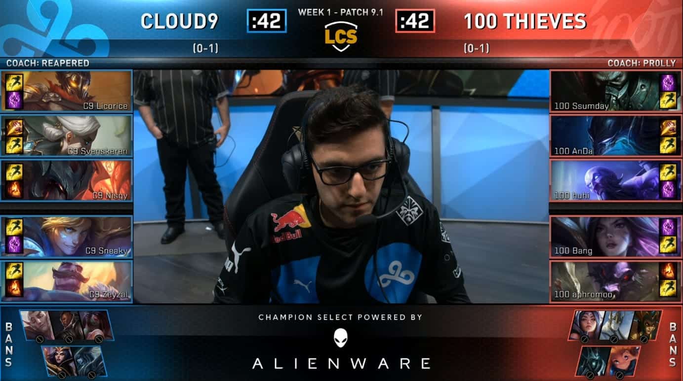 Picking up the pieces after a defeat yesterday, Cloud9 (“C9”) won their match against 100 Thieves (“100T”) in a dominant fashion. They controlled almost every minute of the game, and their snowball all began with their new mid laner, Nisqy. At only four minutes Nisqy solo killed Huhi and burned his Flash. This pressure lead to an easy Ocean Dragon take and helped C9 win a skirmish in the top lane. A few minutes later, 100T showed some signs of life when AnDa stole an Infernal Dragon from C9 and won the ensuing team fight three-for-two.