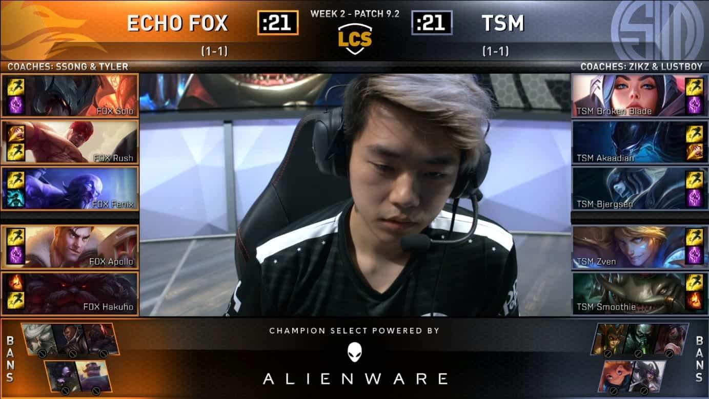 Team SoloMid (“TSM”) defeated Echo Fox (“FOX”) in the first game of the week. The game was close in the beginning though. FOX secured an early Ocean Dragon at five minutes and then Solo made a two-versus-one outplay under his top lane tower that got him two kills for his death. FOX continued their pressure by sending three members top again to kill Broken Blade for a second time. But it wasn’t long until TSM got a hold of the lead at an Infernal Dragon fight. Here, they killed Rush, took the Infernal and asserted pressure over the map.