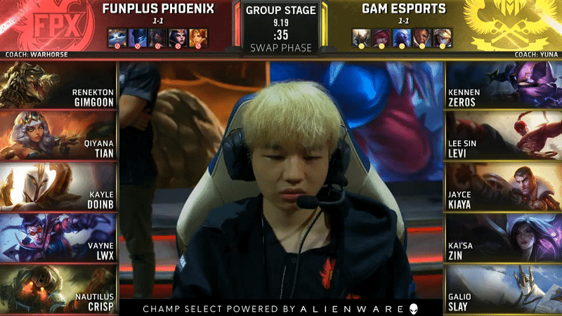 FunPlus Phoenix (“FPX”) rose again to take a 2-1 record in the group. Taking advantage of flashes burnt at a level one invade, Tian found a gank in the bottom lane for first blood. Top lane brought another gank from Tian and this time Levi was there. Levi’s counter gank looked hopeful for GAM Esports (“GAM”) but the resulting fight brought two free kills to FPX. GAM finally found a kill on Tian and FPX found a response on Levi. A kill went to Tian as he invaded Levi for a solo kill. FPX found a 2v2 kill in the bottom lane as they dove top lane. The dive resulted in another kill and the first tower falling.
