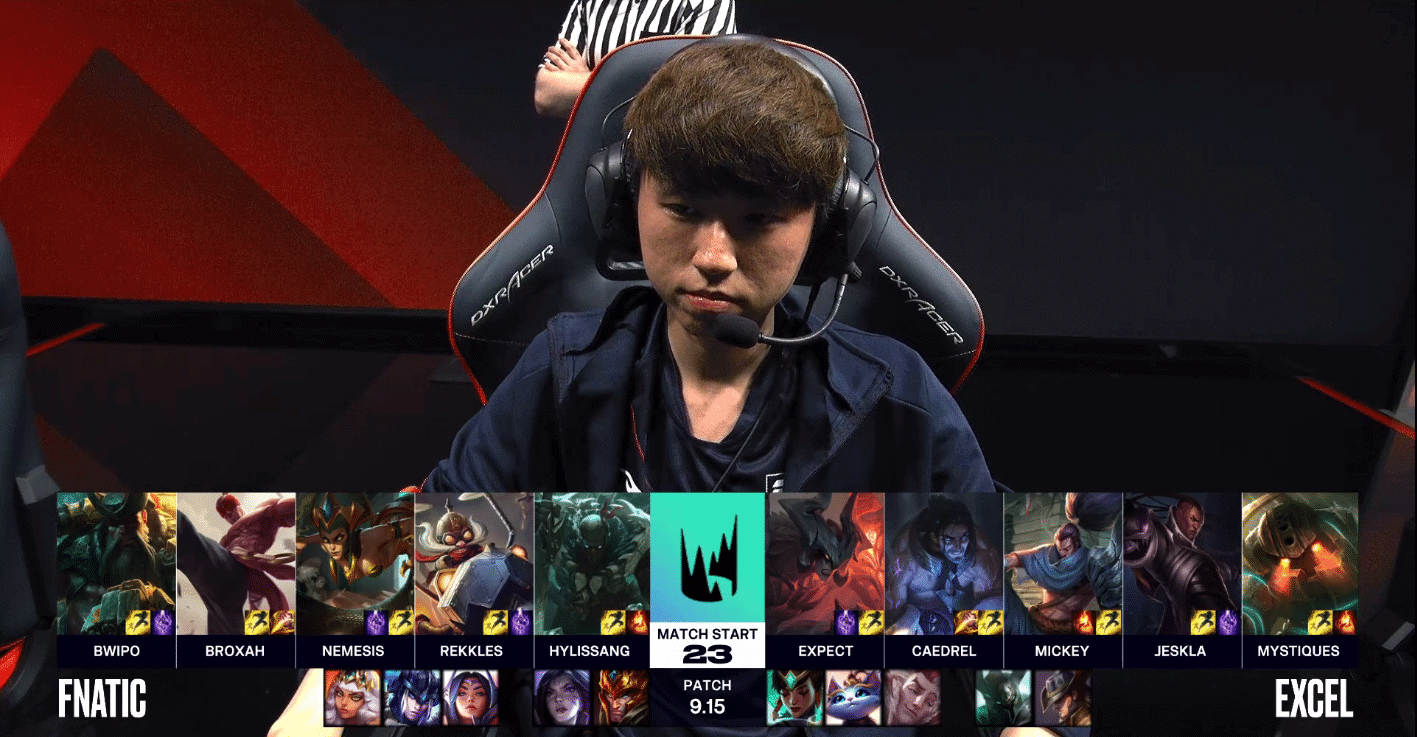 In the third game of the day, Fnatic (“FNC”) defeated Excel Esports (“XL”). It should’ve been a one-sided affair, but XL honestly put up an admirable fight. Though Caedrel overextended in FNC’s jungle and gave over First Blood, Xl made some proactive moves to get themselves a slight lead. They killed both members from the FNC bottom lane multiple times and even secured the First Tower bonus in the bottom lane. But FNC was no slouch either, as they made some aggressive plays of their own.