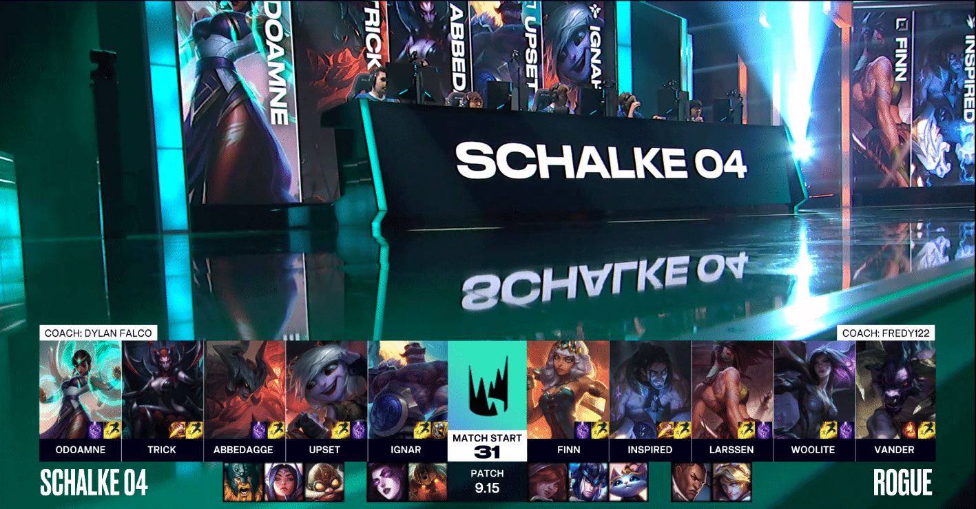 In the second match, Rogue (“RGE”) kept their playoffs hopes alive with a much-needed win over Schalke 04 (“S04”). S04 seemed to have dropped the ball this game, but overall RGE played very well. Thye started their snowball by three-man diving Odoamne in the top lane, where Larssen killed him for First Blood. There was little action for a while, but S04 did manage to take some neutral objectives to stay even. At 19 minutes, RGE picked off Abbedagge, which allowed them to take a tower and a Mountain Dragon.