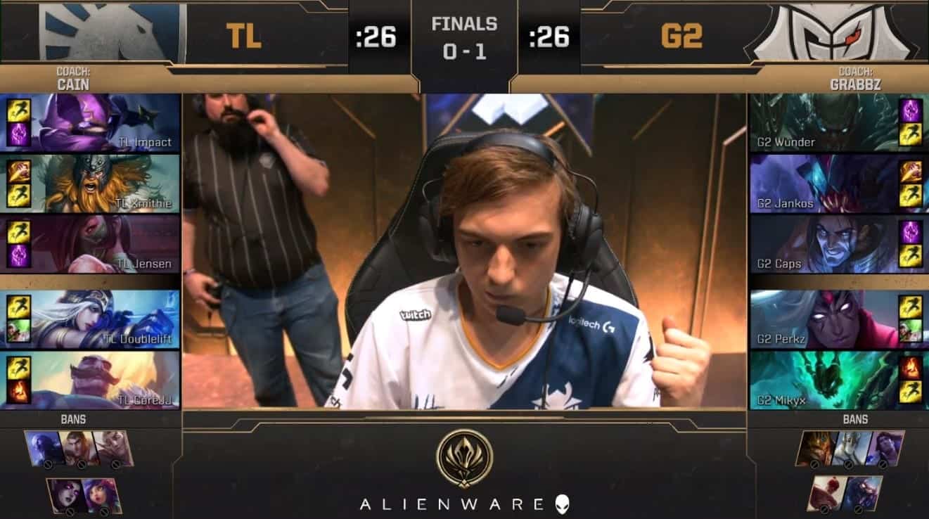 The G2 Esports’ victory in Game One stemmed from their highly aggressive and mobile composition. The Europeans took three teleports on Wunder, Caps, and Perkz and exerted tremendous pressure on the NA bottom lane. The very early in the game saw poor positioning from CoreJJ, who was forced to burn flash before minions spawned. Because of this, G2’s Jankos was able to take advantage of the defenseless support, finding first blood. The game snowballed from there as repeat ganks and teleports extinguished Doublelift and TL’s flame. As a result, G2 was able to set the pace and push momentum leading into the next game.